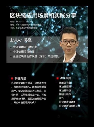 作为西安交大MEM的研究生,同学们时刻把握科技发展动态,不断整合前沿技术资源。为此,2018年3月17日,西安交大MEM深圳7089班邀请到该班级中证信用的云技术总监、金融区块链合作联盟(深圳)项目成员陈坚同学举办了一场关于“区块链应用场景和实践分享”的讲座。讲座上陈同学生动形象、深入浅出地介绍了区块链的特点、发展趋势与应用场景,并向大家分享了在“区块链+信用”领域的工作实践经验。